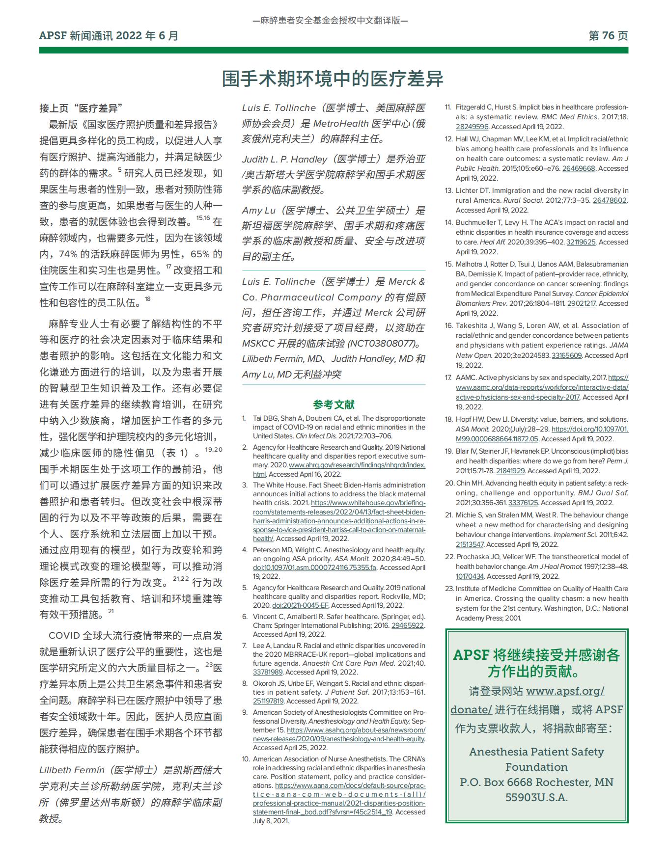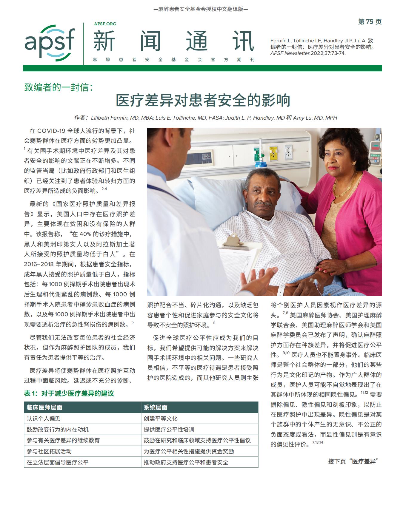 【APSF新闻通讯】致编者的一封信:医疗差异对患者安全的影响