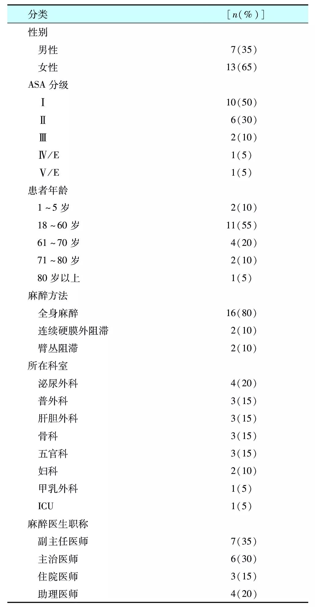 调查期内上报不良事件20例, 分别从性别、年龄、ASA分级、麻醉方法、患者所在科室、不良事件类别统计如下(表1)。