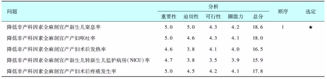 采用回顾性调查法, 选取广东省妇幼保健院2017-04/2018-04期间完成的74例非产科因素气管插管全麻剖宫产产妇作为研究对象, 针对全麻剖宫产存在的问题, 通过脑力震荡法, 利用主题评价表, 根据问题的迫切性、重要性、可行性及圈能力进行打分, 分数最高为本次活动主题, 最终选定降低非产科因素全麻剖宫产新生儿窒息率作为此次品管圈活动的主题(表1)。