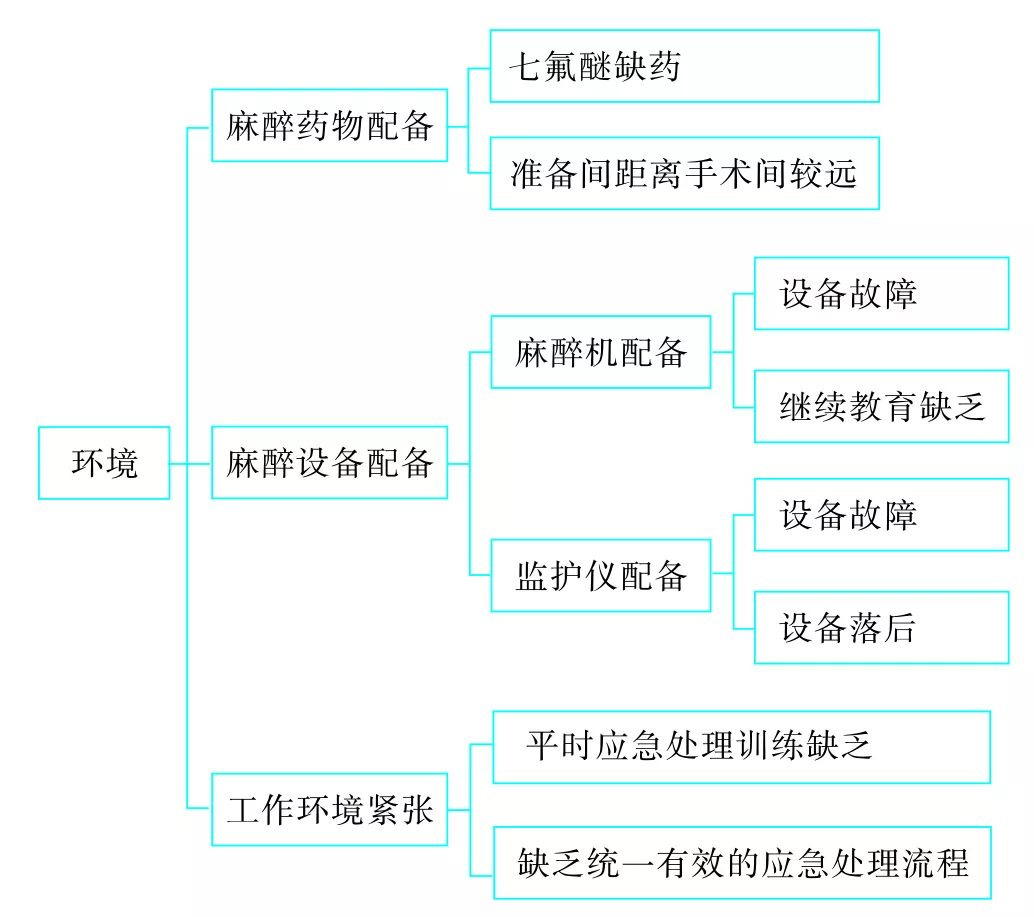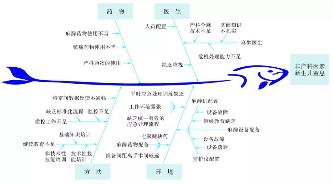 鱼骨图是一种用来发现问题根本原因的分析工具, 是由需解决的问题作为鱼头, 引起问题的根本因素作为鱼主骨, 引起根本因素的限制原因作为鱼次骨。对于那些先天的限制因素, 探讨是否有可能通过人为努力去进行改进; 对于那些因现有条件限制而暂时无法改进的因素, 探讨是否有可能通过改进其他因素而进行弥补[6]。本研究中剖宫产全麻非产科因素新生儿窒息的发生率为62.5%, 远高于赵方芳等[7]调查研究中的4.7%。对此, 我们以鱼骨图进行原因分析, 从人员、药物、方法、 环境4 个方面, 归纳其中的根本因素。