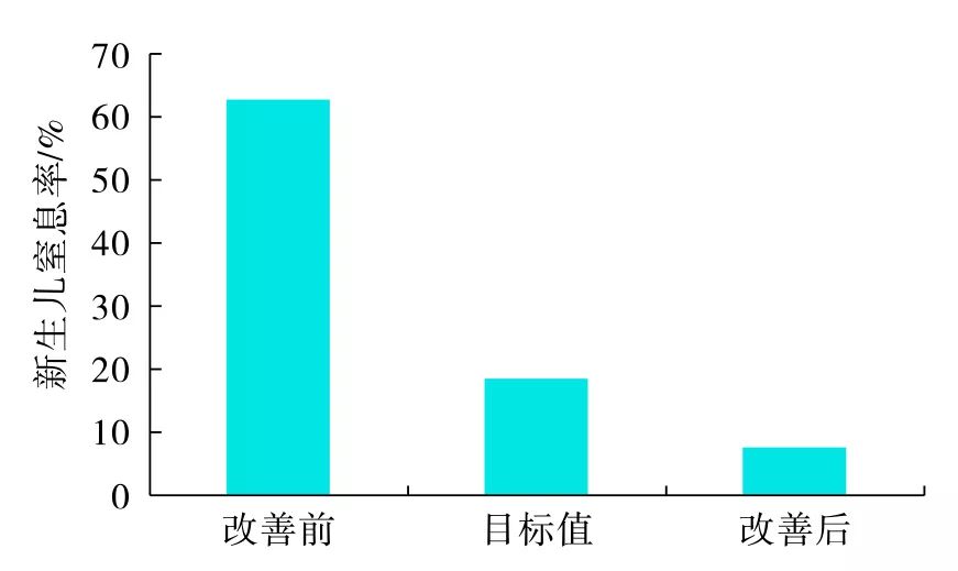 1.2.1.3 制定目标根据行动计划及现状把握, 非产科因素全麻剖宫产新生儿窒息率目标值=现状值-(现状值×改善重点×圈能力), 计算为 62.5%-(62.5%×84%×84%)=18.4%。