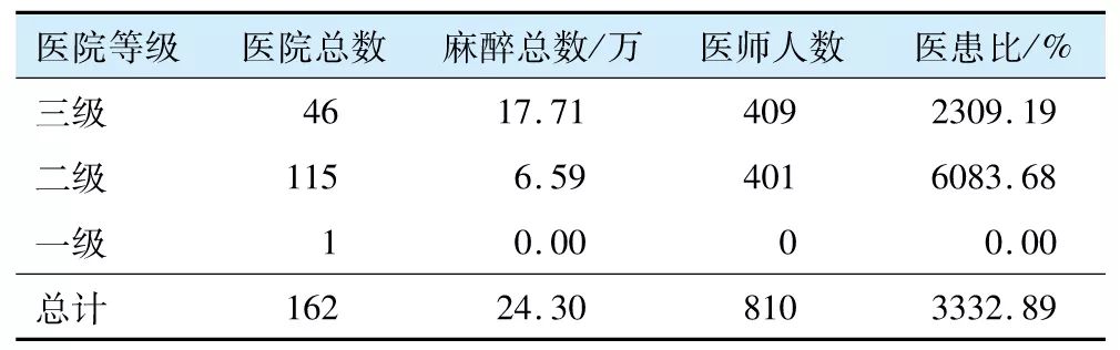 本次调查中所有医院均反馈了指标,多数可通过信息系统获得,按等级统计麻醉总数与医患比(表1)。调查结果提示:虽然“三级医院”数目仅占医院总数的28%,却承担了省内近73%的麻醉工作量,提示我省分级诊疗工作有待提高,基层医院的工作量有很大的控掘空间,需加强麻醉质量提升工作,增加百姓就医的信心。同时由于“三级医院”的工作强度大,麻醉质量控制也需要随之加强,防控麻醉相关不良事件的发生。“三级医院”的医患比是“二级医院”的1/3,低于国家标准,提示“三级医院”的麻醉医生处于长期过劳状态,严重影响身心健康,且已成为麻醉安全隐患,需要引起重视[4]。