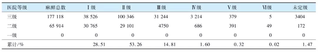 表2 各级医院ASA分级麻醉例数及ASA分级麻醉例数累计百分比