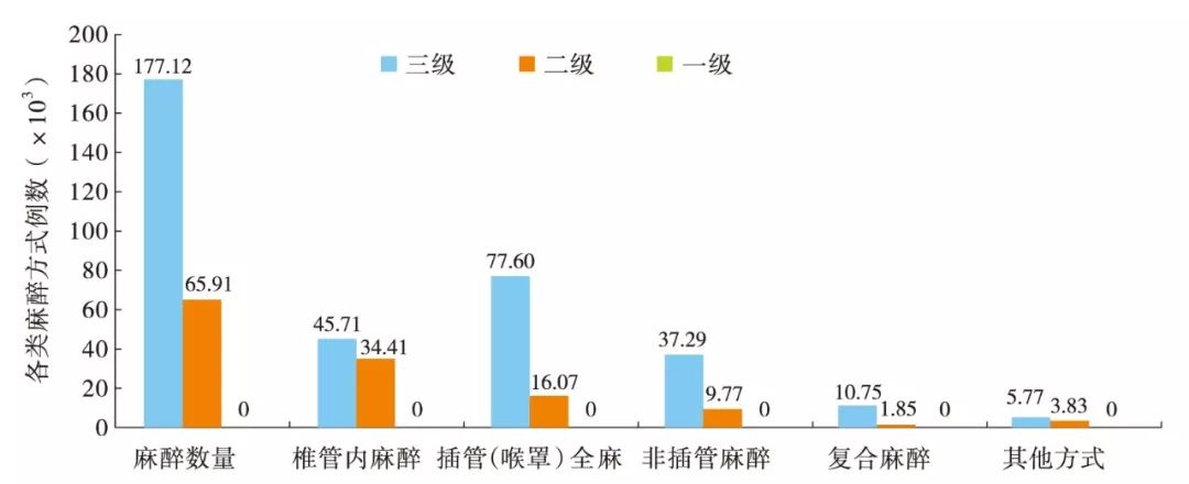 图1 不同等级医院各类麻醉方式数量对比