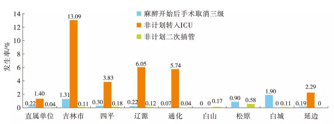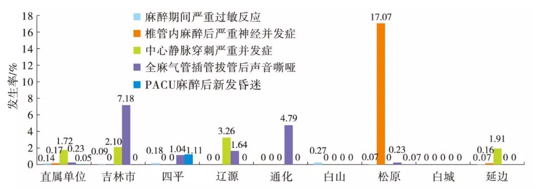 以上各指标是麻醉严重不良事件,应值得关注(图3)。麻醉期间严重过敏反应发生率各中心均较低,但仍需尽早识别及处理。松原市分中心椎管内麻醉后严重神经并发症发生率较高,与其较多采用椎管内麻醉有关,应提高椎管内麻醉穿刺技能或采用超声引导下穿刺,减少并发症发生。虽然中心静脉穿刺严重并发症发生例数较少,但是进行穿刺的分中心发生严重并发症的概率均较高,宜利用超声可视化技术定位或全程引导,减少不良并发症。吉林市分中心有较高全麻气管插管拔管后声音嘶哑发生率,可推广可视喉镜的应用降低其发生率。四平市分中心有较高PACU麻醉后新发昏迷发生率,应尽快提高麻醉与手术质量和水平,保证麻醉质量。