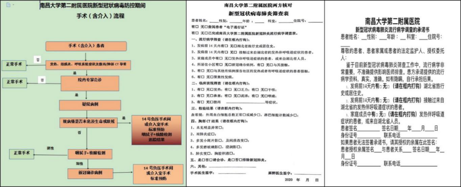 本次新型冠状病毒传染性强,手术麻醉科位于主体大楼3楼,由于采用层流通风方式,环境相对封闭,加之手术人员来自各个科室,一旦被污染和暴露,将快速传播,势必导致大面积的院内感染。为了及时、有序、科学地开展防控工作,徐国海主任和余树春主任在假期还未结束就召集科室,按照医院抗击冠状病毒新冠肺炎工作指示,结合科室工作特点制定《南昌大学第二附属医院新型冠状病毒防控期间手术(含介入)流程》,内容包括南昌大学第二附属医院两方核对新型冠状病毒肺炎筛查表、疫情期间微信交班格式、择期和急诊手术原则和流程、确诊及高度疑似患者手术流程以及外出抢救插管操作流程等等。