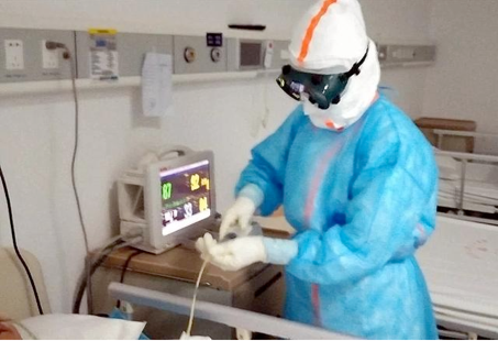 自治区人民医院麻醉科护士汪丽在武汉大学人民医院东院病区内为危重患者做治疗