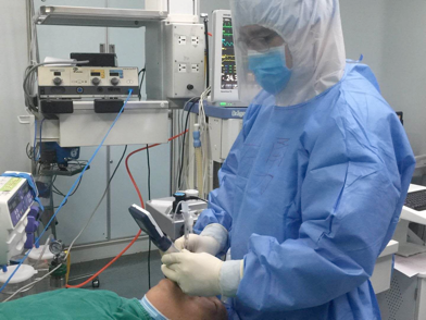 防疫期间驻守在自治区人民医院麻醉科的医护人员为患者做气管插管
