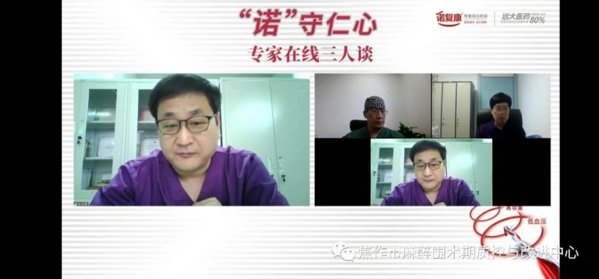 二、焦作市麻醉质控中心张占军主任和安阳市麻醉质控主任张志军,新乡市麻醉质控主任岳修勤主任开展“专家在线三人行”,豫北三市麻醉医生在线集中培训学习麻醉手术在疫情面前的注意事项。为在线麻醉医生答疑解惑,获得了豫北地区同行的高度称赞。