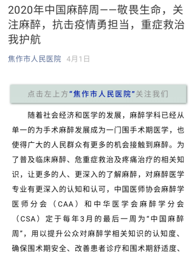 四、积极在医院公众号,焦作市麻醉质控公众号宣传麻醉科普,以及疫情防控知识。
