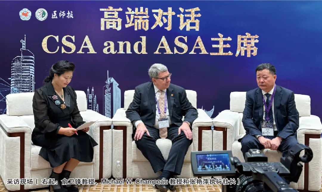 中国麻醉学在世界麻醉学舞台上扮演什么样的角色?从麻醉大国走向麻醉强国,我们还有哪些方面要重点突破?在中华医学会第28次全国麻醉学术年会上,《医师报》社执行社长兼执行总编辑张艳萍对话中华医学会麻醉学分会(CSA)主委俞卫锋教授和美国麻醉医生协会(ASA) 主 席 Michael W. Champeau教授,畅谈麻醉学未来发展。